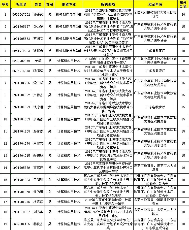 根据《广东省教育厅关于做好2013年高等职业院校自主招生试点工作的通知》(粤教考函﹝2013〕4号)和《2013年东莞职业技术学院自主招生章程》文件精神,经初审核,我院2013年自主招生有以下考生具备加分资格,现予以公示。如对拟加分的考生有异议,请电话或书面向我校招生办反映,要求反映人提供真实姓名和联系方式,否则将不予受理。无异议的考生将在录取时报省教育考试院,由考试院最终审核加分资格。
